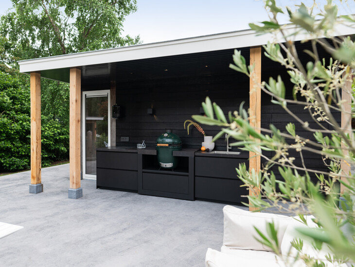 Furthermore, socializing. A garden kitchen is the place where people gather to discuss their day and enjoy culinary creations. So, it's not just about the Big Green Egg or other barbecue taking center stage, but also a bar so that friends and family can always join in the fun. Or how about other comfortable equipment that you're used to indoors? Think of a luxury outdoor refrigerator, sink with a faucet, or the always practical outdoor induction cooktop.