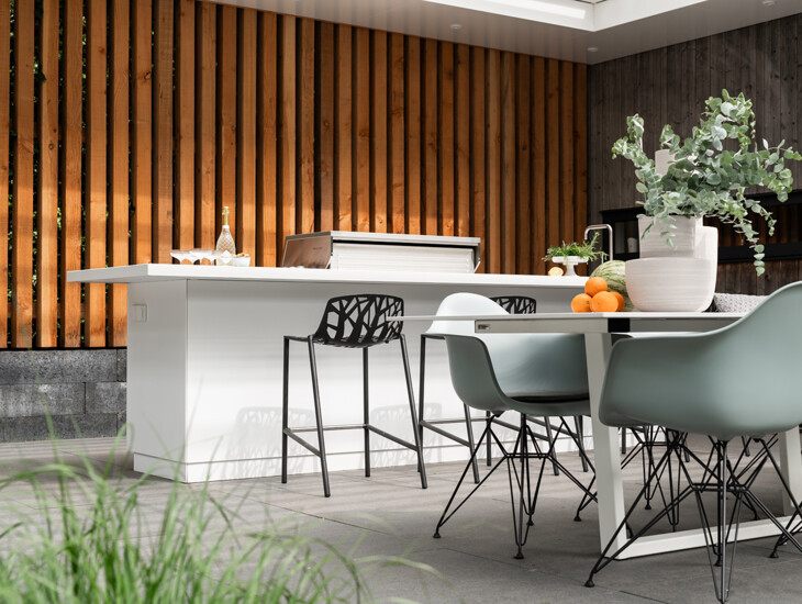 A white outdoor kitchen is a real eye-catcher and fits into many garden styles