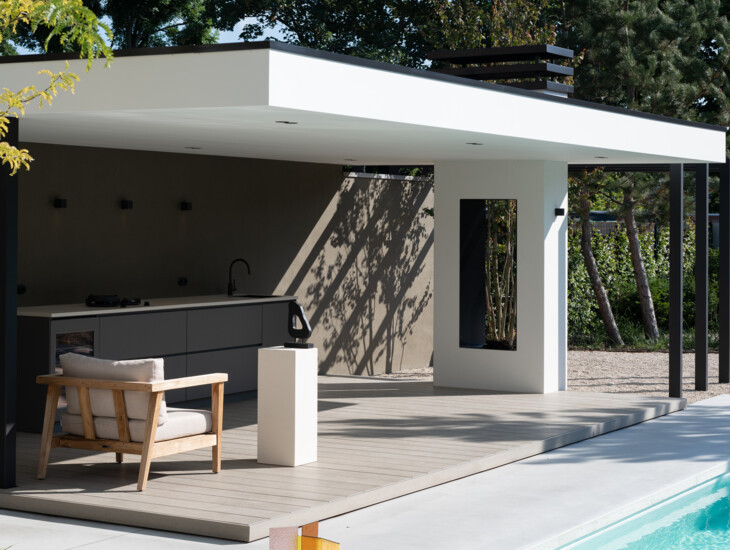 Een andere mogelijkheid is een compacte pantry in het poolhouse of de tuinkamer. Zo benut u de ruimte optimaal en heeft u altijd de essentiële benodigdheden binnen handbereik, of het nu een glas verfrissend water is of een gekoeld drankje uit de outdoor-koelkast. Met een overkapping buitenkeuken heeft u alles bij de hand.