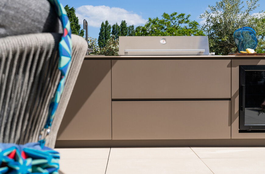 De kracht van de Concepts Cooktop 240 buitenkeuken ligt in het slimme en efficiënte ontwerp. De Beefeater-gasbarbecue wordt naadloos geïntegreerd in de kasten, waardoor maximale opbergruimte behouden blijft.