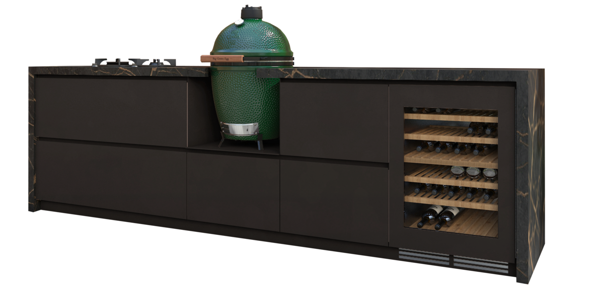 Chique buitenkeuken met Big Green Egg en koelkast