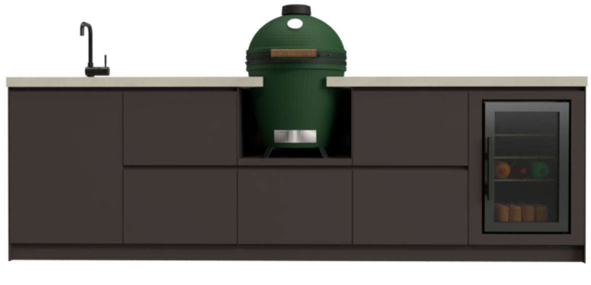 De ultieme buitenkeuken voor u als outdoor-liefhebber. Deze COOXS heeft alles wat u zich kunt wensen voor avonden lang buiten genieten. Centraal in het tijdloos ontworpen meubel vindt u de Big Green Egg die geflankeerd wordt door buitenkoelkast en spoelbak met kraan. De buitenkeuken is volledig weerbestendig en gemaakt van de beste materialen zoals gepoedercoat aluminium en Dekton werkbladen. Genieten staat zo centraal.