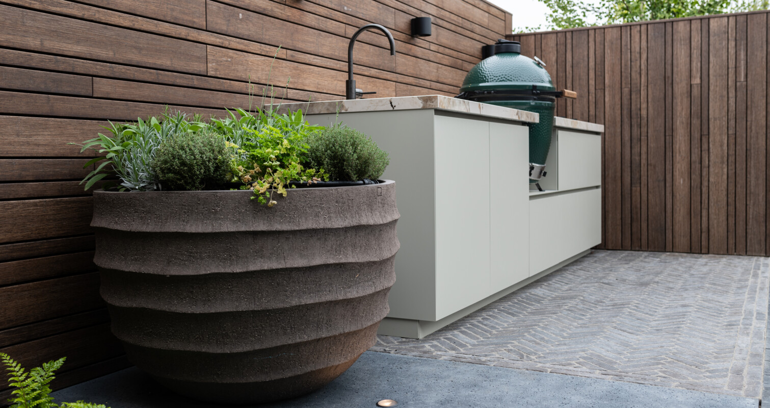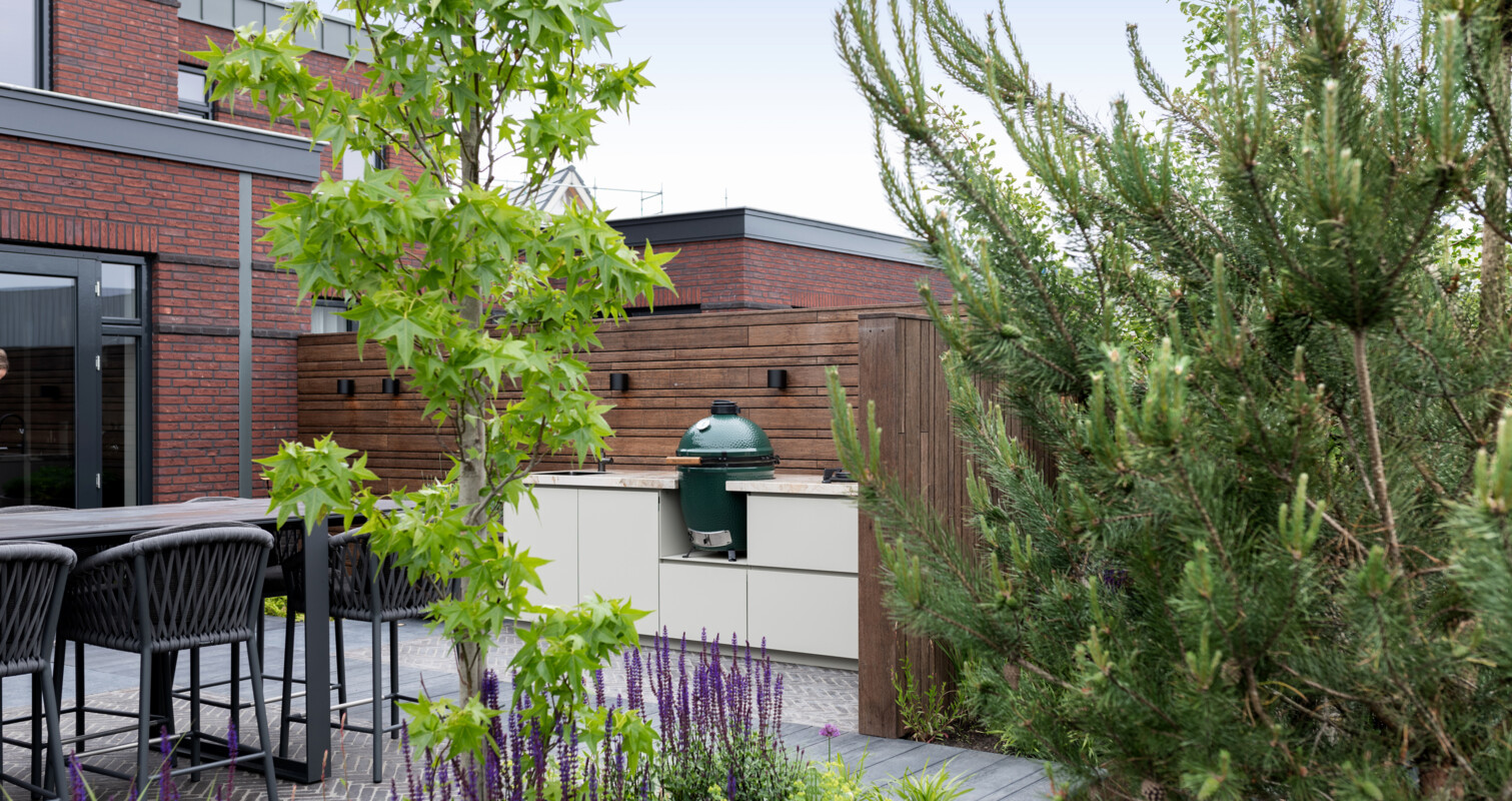 De perfecte balans tussen sfeer en ultieme luxe. Dat is bereikt in deze sfeervolle tuin met luxe buitenkeuken in Naaldwijk. Voor de klant realiseerden wij hier een maatwerk buitenkeuken met Big Green Egg barbecue, gaspitten van PITT cooking en spoelbak met kraan. Kenmerkend aan de buitenkeuken is het excentrieke, Dekton werkblad in combinatie met de warme kleur van de kasten. Deze combinatie past goed in de mediterrane sfeer van de tuin en vormt een warme combinatie met de houten achterwand.