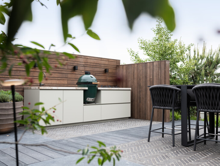 In het ontwerp van deze sfeervolle buitenkeuken is gekozen voor een kenmerkende combinatie van materialen. Het in een sfeervolle kleur gecoate aluminium is een mooie combinatie met het hoogglans, Dekton werkblad. Deze combinatie is perfect afgestemd met de rest van de materialen in de tuin zodat in het totale ontwerp een evenwichtige balans ontstaat.