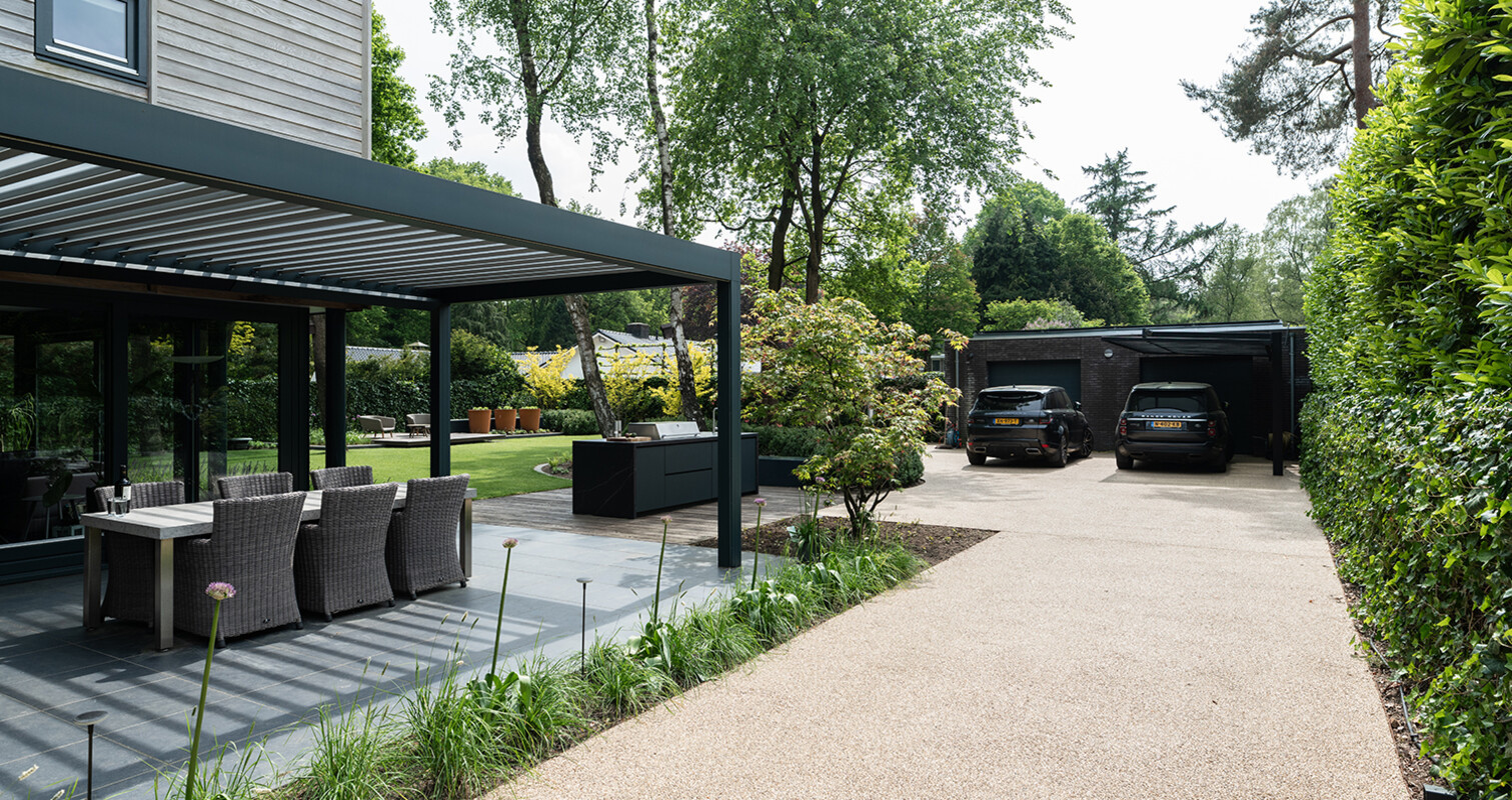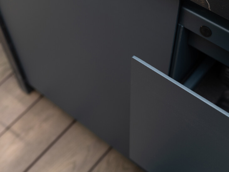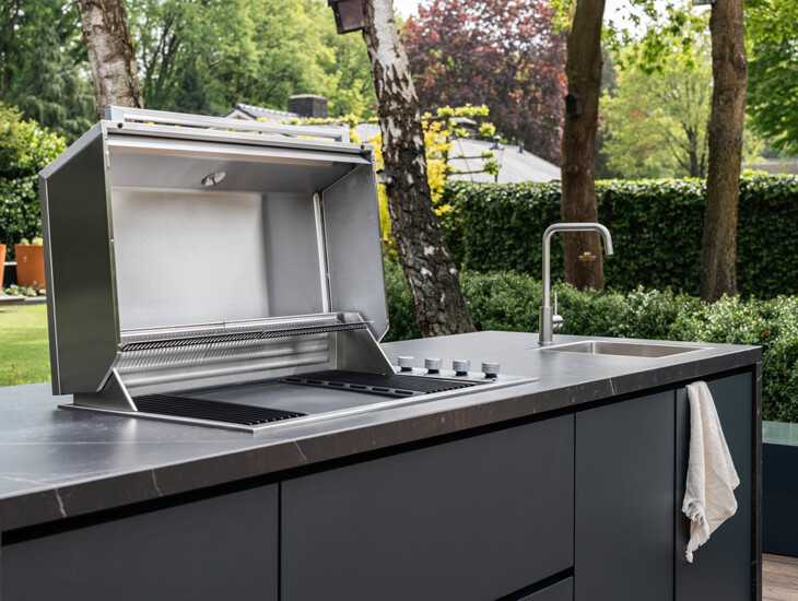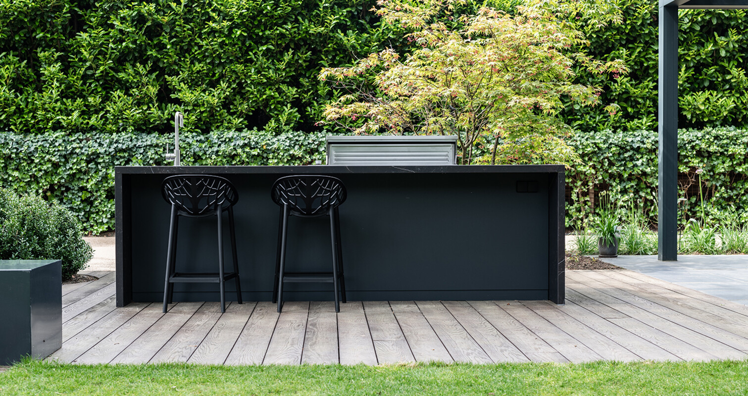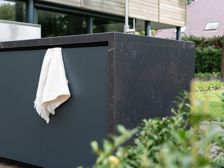 De tuin bij deze villa heeft een complete make-over gehad. Centraal in het tuinontwerp is de COOXS buitenkeuken opgenomen. Gezien de prominente plek is er gekozen voor een opvallend design. De tijdloze, donkere kleurstelling is de perfecte match met de karakteristieke groene omgeving. Door de buitenkeuken, naast exclusieve apparatuur, ook te voorzien van een bar aan de achterzijde, is het een plek geworden om samen te komen en maximaal te genieten van een exceptioneel buitenleven.