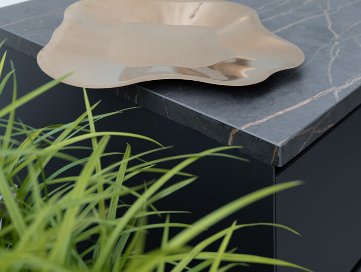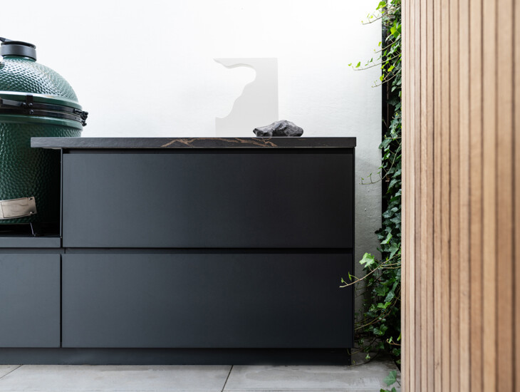 Het ontwerp van deze buitenkeuken wordt gekenmerkt door de typerende, elementaire balans. Centraal is de Big Green Egg Large opgesteld. De kasten van het meubel hebben een symmetrische vormgeving en zorgen zo ook voor rust en eenheid in het ontwerp.