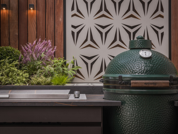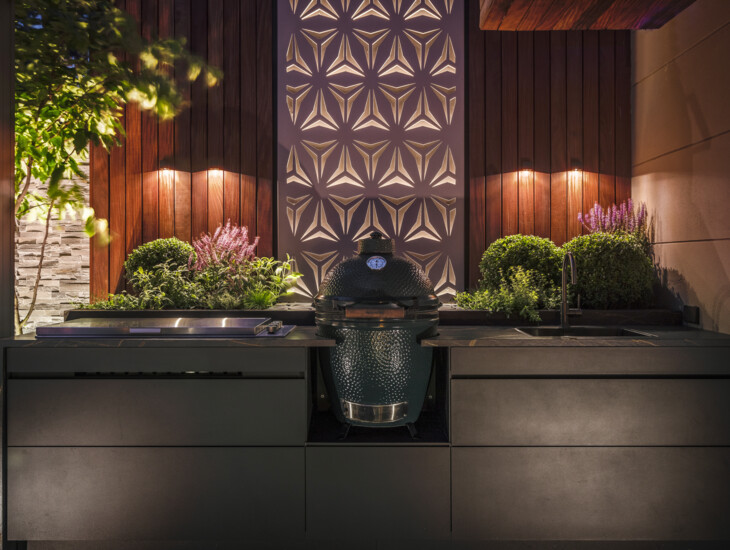 De maatwerk buitenkeuken komt extra goed tot zijn recht doordat de maten perfect zijn afgestemd op de verhoudingen in het tuinontwerp.