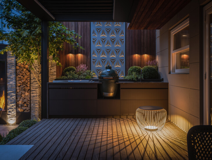In een door Knops Tuindesign ontworpen tuin realiseerden wij deze unieke, chique buitenkeuken. Samen met de tuinarchitect is het ontwerp gemaakt en is er gekozen voor een unieke combinatie van het Dekton Laurent werkblad en de donkerbruine kasten. Tijdloos en elegant als ultieme combinatie.