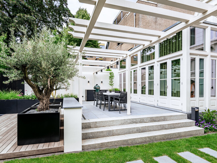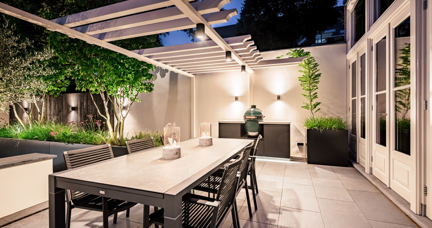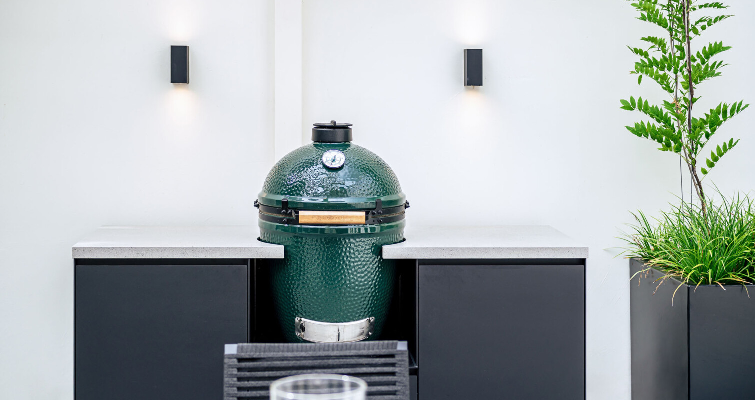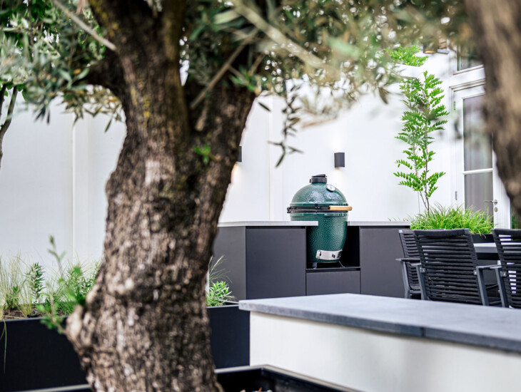 Bij de monumentale woning, in het hart van Groningen, ontwierp TIM Exclusive Gardens een hoogwaardige en comfortabele designtuin. In het ontwerp van de tuin komen alle facetten van een ultiem buitenleven samen. Centraal op het terras, bij de woning, realiseerde COOXS een comfortabele en compacte buitenkeuken. In deze buitenkeuken staat de Big Green Egg barbecue centraal. Door de keuken subtiel uit te lichten met de up-down-spots op de achterwand en de led-strip bij de plint is de keuken ook 's avonds een parel van geluk.