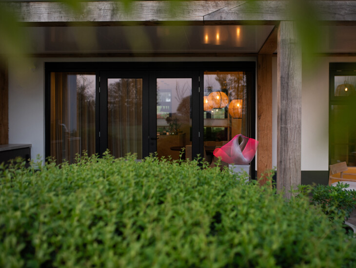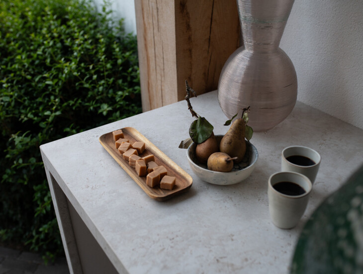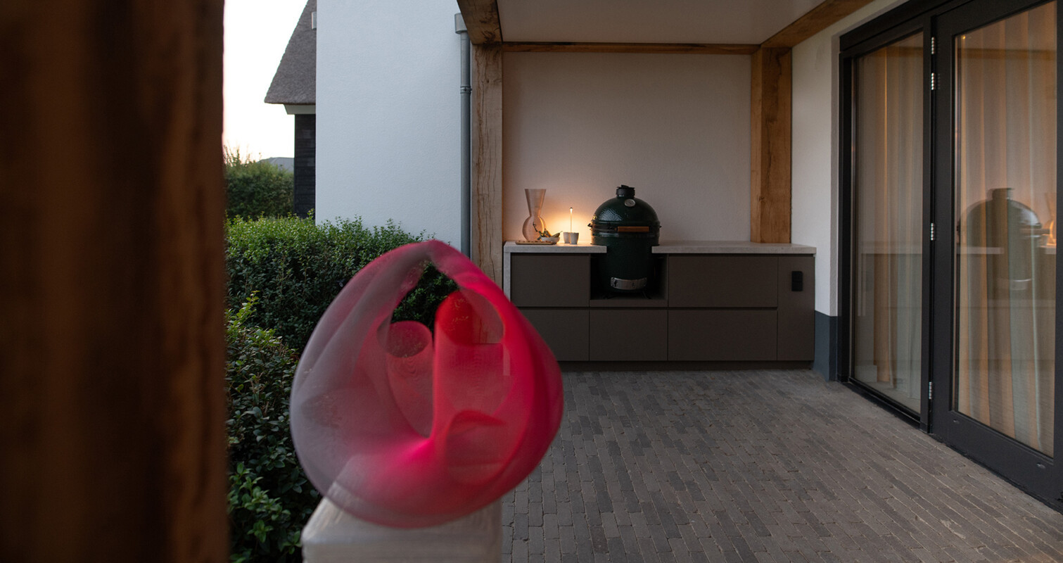 Het ontwerp van de buitenkeuken vormt een duidelijke eenheid met het tuinontwerp én de architectuur van de woning. De warme kleuren komen terug in het hele ontwerp, en de robuuste stijl van de veranda is terug te zien in de goed doordachte details van de buitenkeuken.