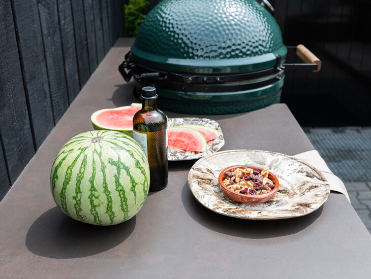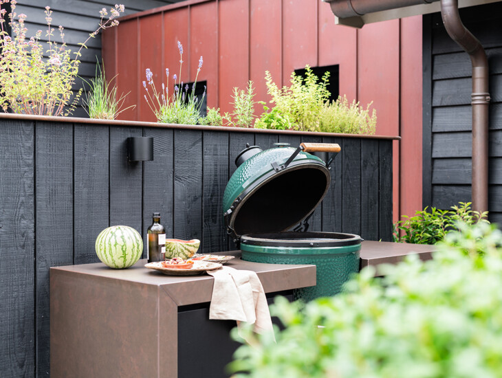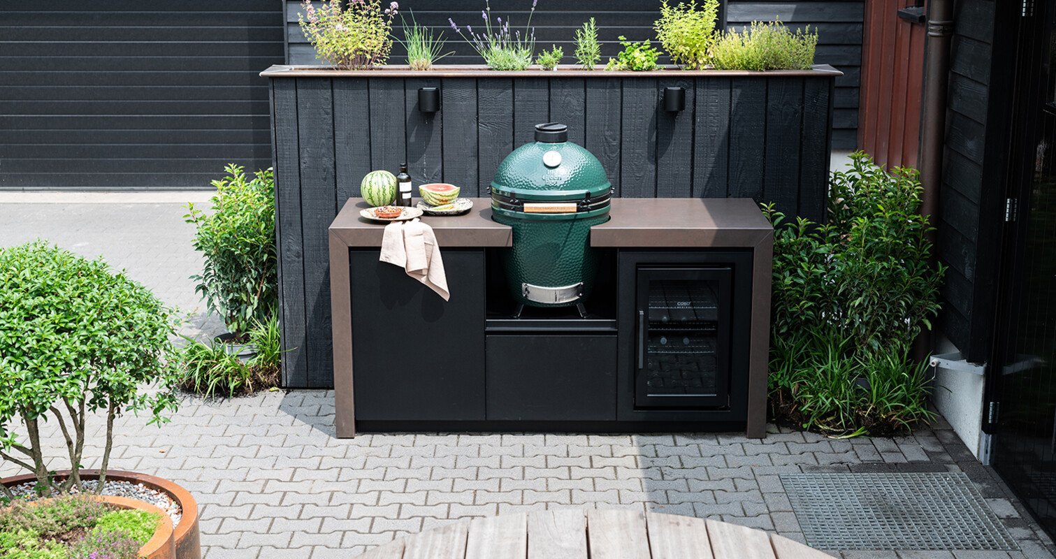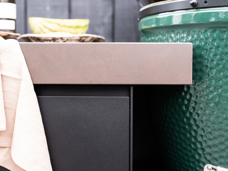 Het robuuste werkblad in een warme, leatherlook kleur loopt door in de zijwanden. Zo ontstaat een blokelement en wordt de buitenkeuken als vanzelf een in het oog springend element. De centraal opgestelde Big Green Egg is strak ingebouwd in het werkblad en wordt geflankeerd door een handige opbergkast en een kast met buitenkoelkast.