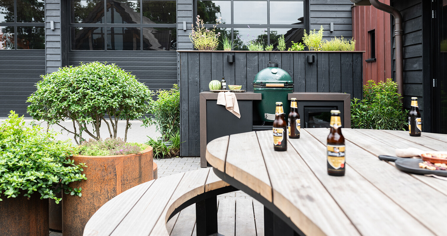 Van een afstand is hij al goed zichtbaar: de COOXS buitenkeuken is een in het oog springend element in de tuin van Bunt Hoveniers. Het robuuste werkblad in een leatherlook is een elegante match met de diep zwarte kasten en de bronzen details van de naastgelegen schuur. De symmetrie van de buitenkeuken wordt extra versterkt door de kruidenbak met opbouwspots aan de achterzijde. Door in het verlengde van de keuken een picknickbank van formaat te plaatsen, nodigt de keuken uit om gebruikt te worden. Legendarische vrijdagmiddagborrels op niveau liggen zo binnen handbereik.