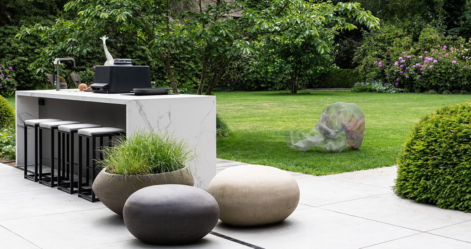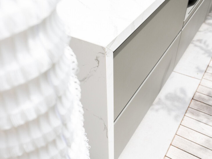 Symmetrie met een frisse kleurstelling maken van de buitenkeuken een echte eyecatcher. Het witte werkblad contrasteert mooi met de kasten in een warme, grijze tint. Door ervoor te kiezen om het werkblad aan de zijkanten door te laten lopen wordt de buitenkeuken mooi omsloten en ontstaat er een geheel in het ontwerp.