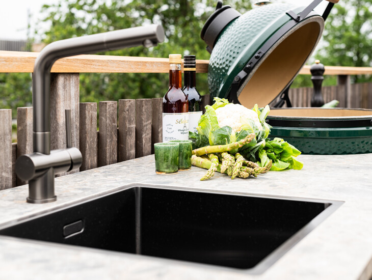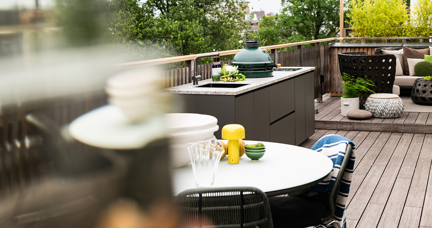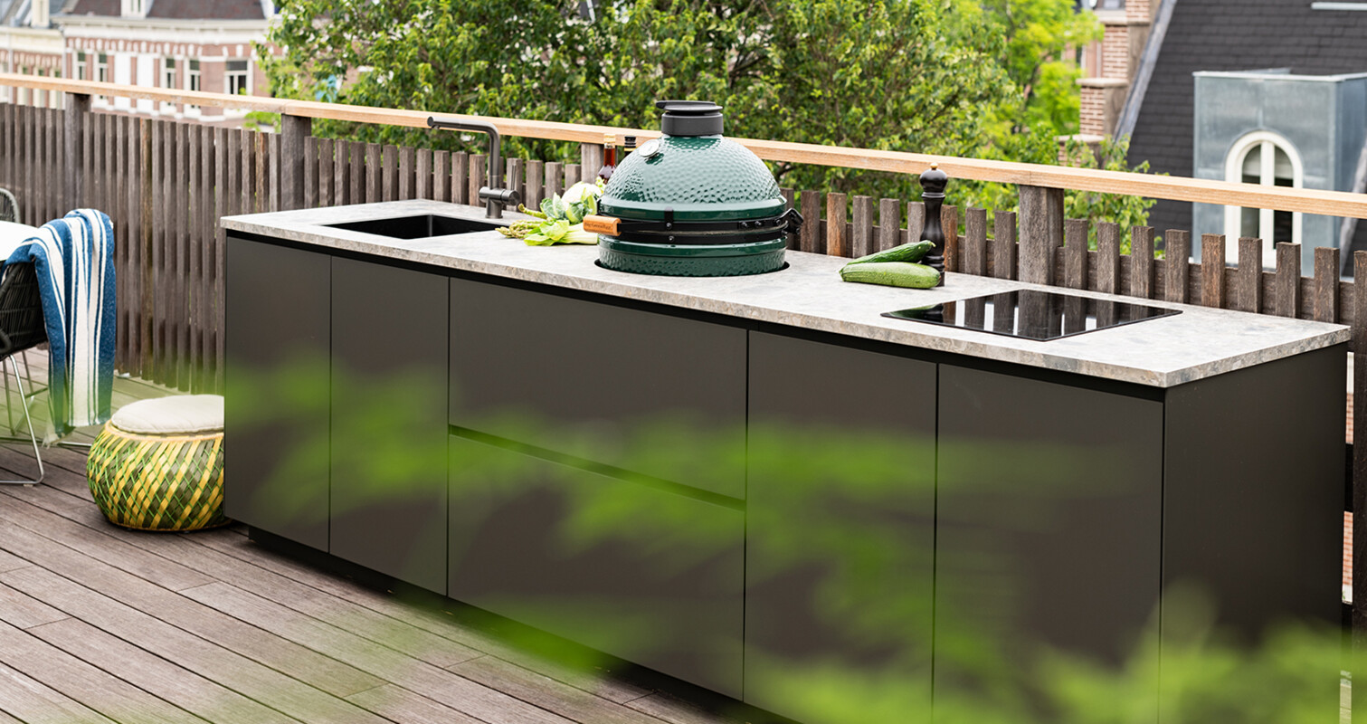 Een buitenkeuken voor liefhebbers van hoogwaardig buiten koken en luxueus design. Deze buitenkeuken op een dakterras in het hart van Amsterdam biedt het allebei. Centraal in de buitenkeuken is er gekozen voor een Big Green Egg Medium, die strak is ingebouwd in het werkblad en de kasten. De Big Green Egg barbecue wordt geflankeerd door de gunmetal spoelbak met kraan aan de ene kant en de Indu+ inductie kookplaat aan de andere kant. Deze elementen, die zorgen voor ultiem buitenkookcomfort, zijn in een duidelijke gestileerde balans ingebouwd, wat zorgt voor rust in het ontwerp.