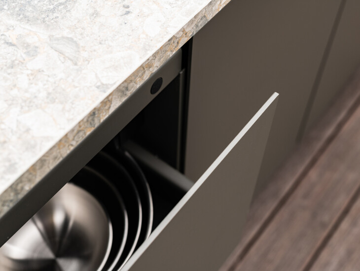 Het strakke lijnenspel van de buitenkeuken wordt versterkt door de moderne greeplijsten. Dit benadrukt tegelijkertijd de lengte van het dakterras. Qua kleuren is er gekozen voor een mooie match met de andere materialen op het dakterras. De kleuren zijn speels en tegelijkertijd tijdloos, waarbij de kwaliteit van de kleurencombinatie overeenkomt met de kwaliteit van de materialen.