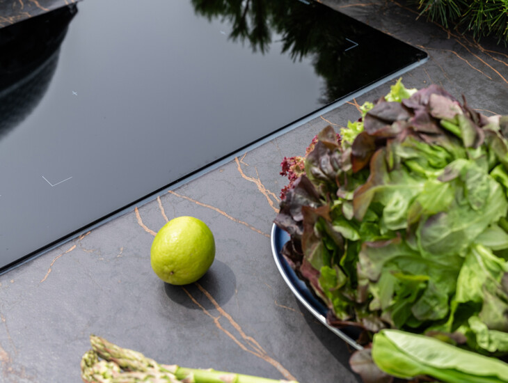 Strak, chique en perfect in balans. De stijlkenmerken van COOXS komen mooi naar voren in deze complete, luxe buitenkeuken. Het werkblad in de kleur Laurent is opvallend door de gouden ader op een donkere ondertoon. Deze ondertoon sluit mooi aan op de donkerbruine kasten. Een kleurencombinatie die gaat leven in het zonlicht en perfect past bij de rest van het dakterras.