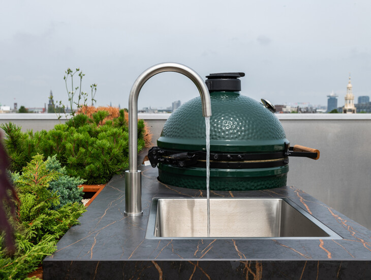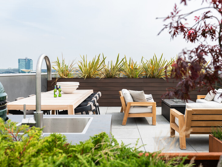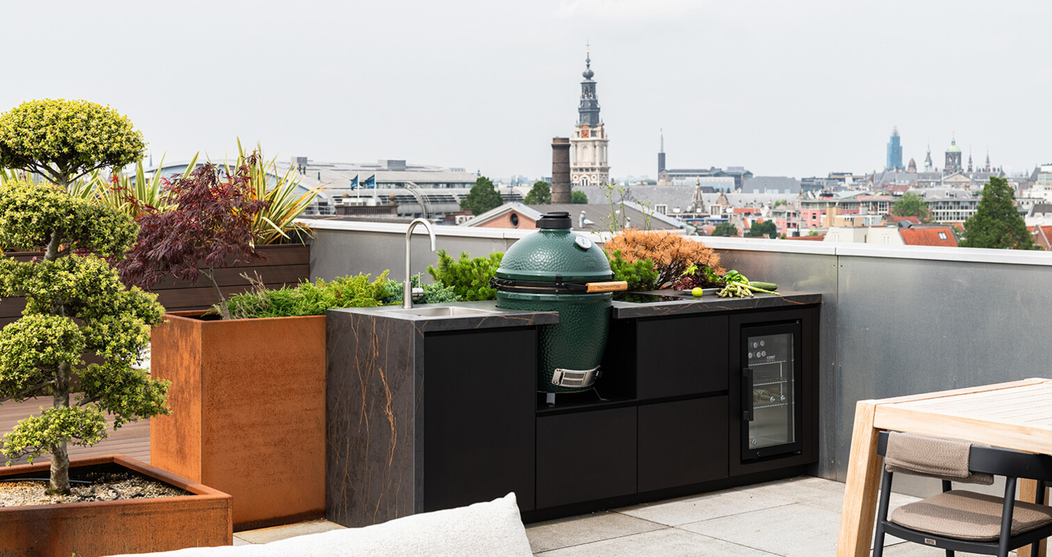 Een buitenkeuken met vuurtafel in dezelfde stijl. In dit project is over ieder detail nagedacht wat zorgt voor een prachtig totaalbeeld van hoogwaardig comfort en luxe. Centraal op het dakterras staat de complete COOXS buitenkeuken met Big Green Egg barbecue, inductie kookplaat, spoelbak met kraan en outdoor-koelkast. Dit rijke palet aan apparatuur is zorgvuldig ingebouwd in één design-element welke uitgevoerd is in warme en chique kleuren. In exact dezelfde stijl als de buitenkeuken is een vuurtafel ontworpen die verderop op het dakterras staat. Zo zijn koken en loungen op éénzelfde, hoogwaardig niveau.