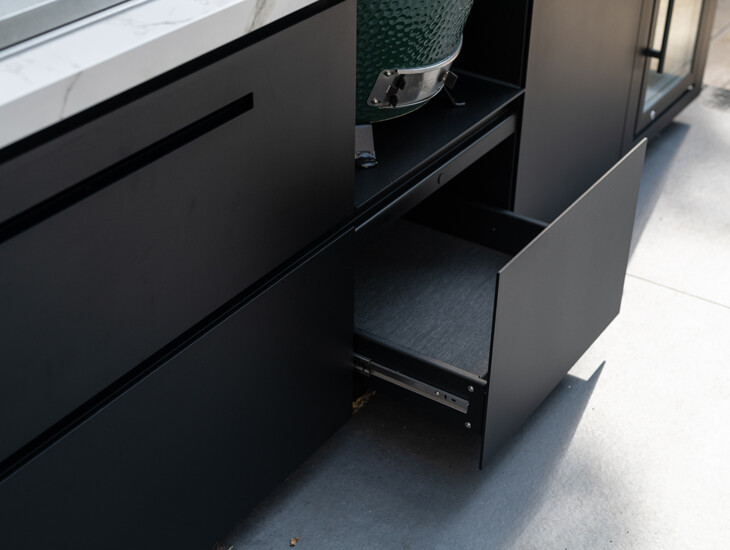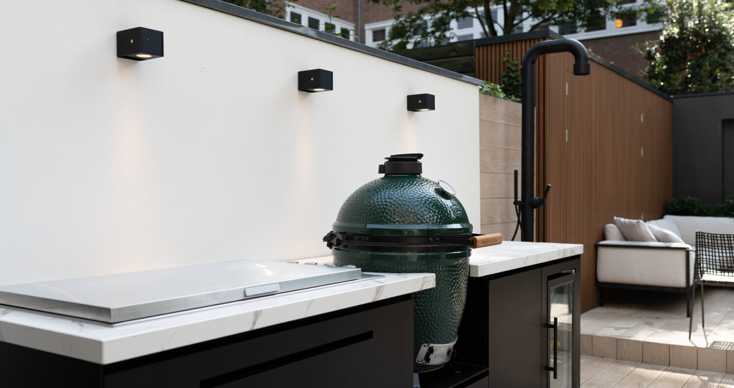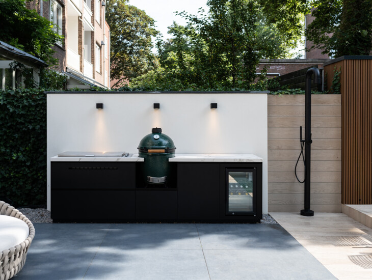 Het ontwerp van de buitenkeuken is gemaakt rondom de kenmerkende én comfortabele Big Green Egg barbecue. Deze barbecue wordt geflankeerd door een luxe gasbarbecue van het Australische merk Beefeater en een passende outdoor-koelkast. Deze combinatie van accessoires maakt van de buitenkeuken dé plek om samen te komen en te genieten van al het comfort dat buitenleven te bieden heeft.