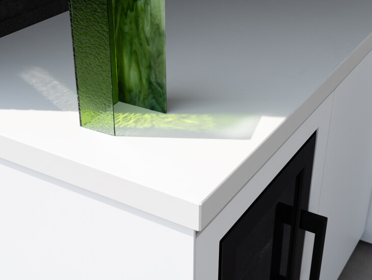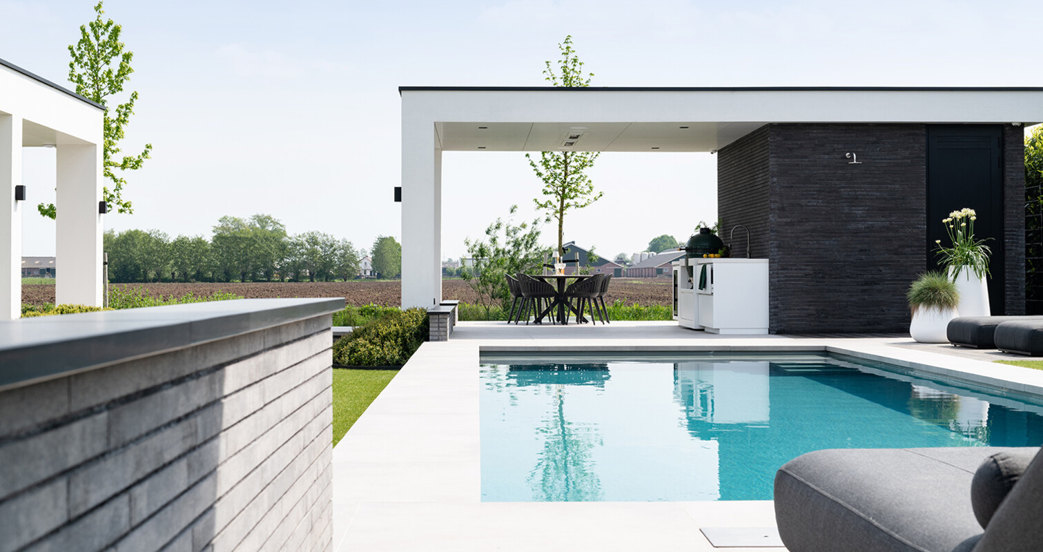 In het ontwerp van de COOXS buitenkeuken sluit deze aan bij de architectuur van de woning én de tuin. De tijdloze witte kleurstelling is perfect doorgetrokken, en de verhoudingen van de buitenkeuken zijn in balans met die van het poolhouse.