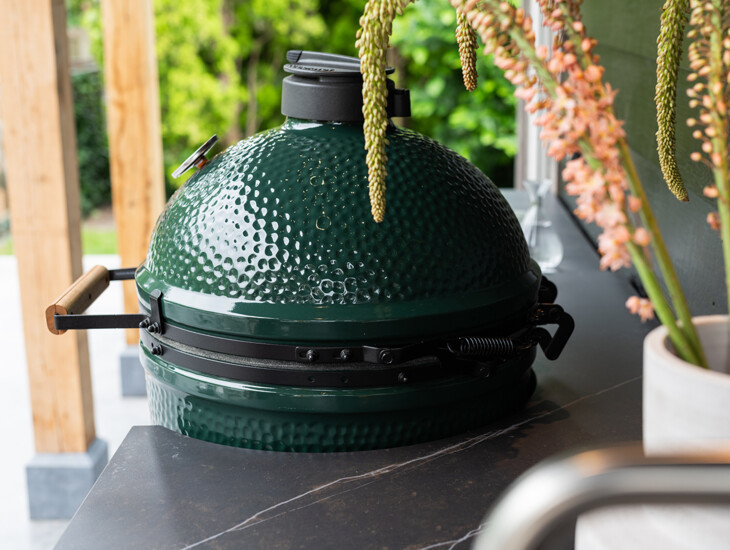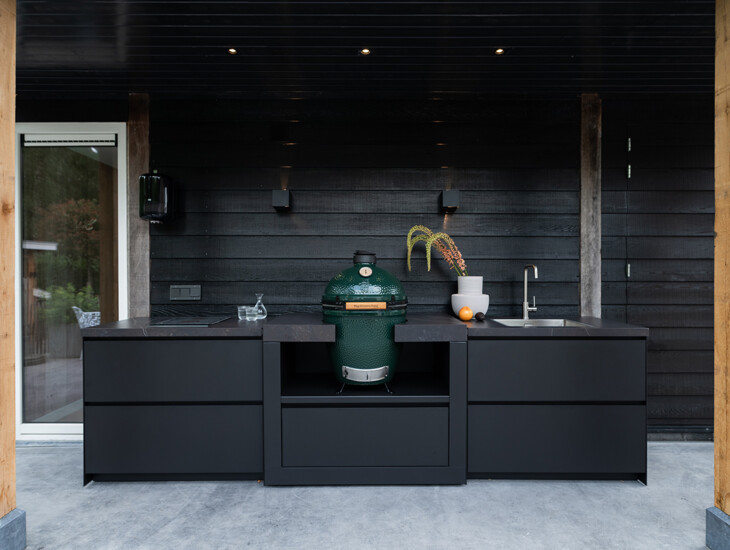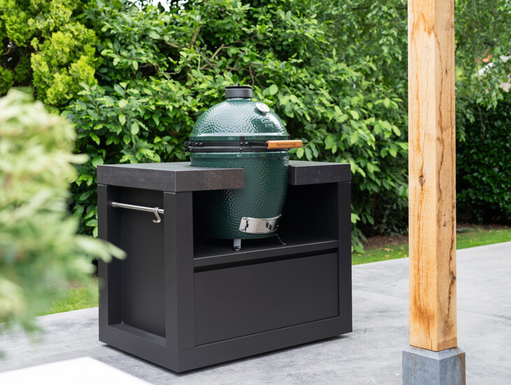 Strakke lijnen met een centraal, robuust element als verrijdbaar deel. Deze buitenkeuken is tot in de laatste details doordacht en dat kan je zien. Het verrijdbare deel is voorzien van een Big Green Egg Large, die wordt geflankeerd door twee vaste delen met daarin een teppanyaki bakplaat en een spoelbak met kraan.