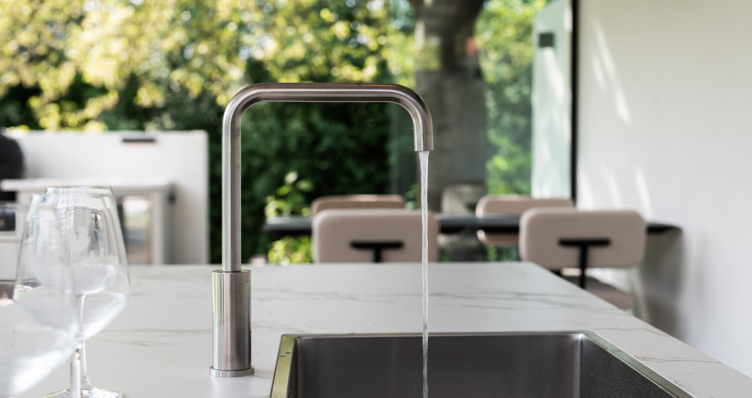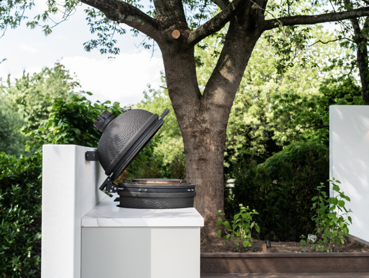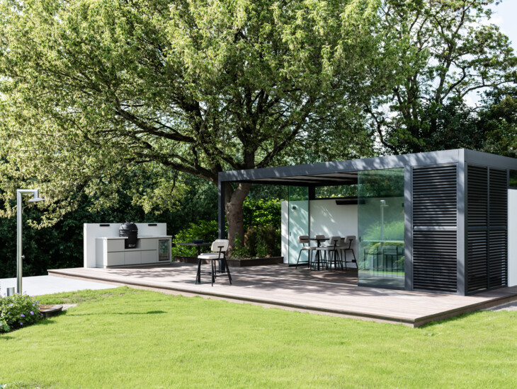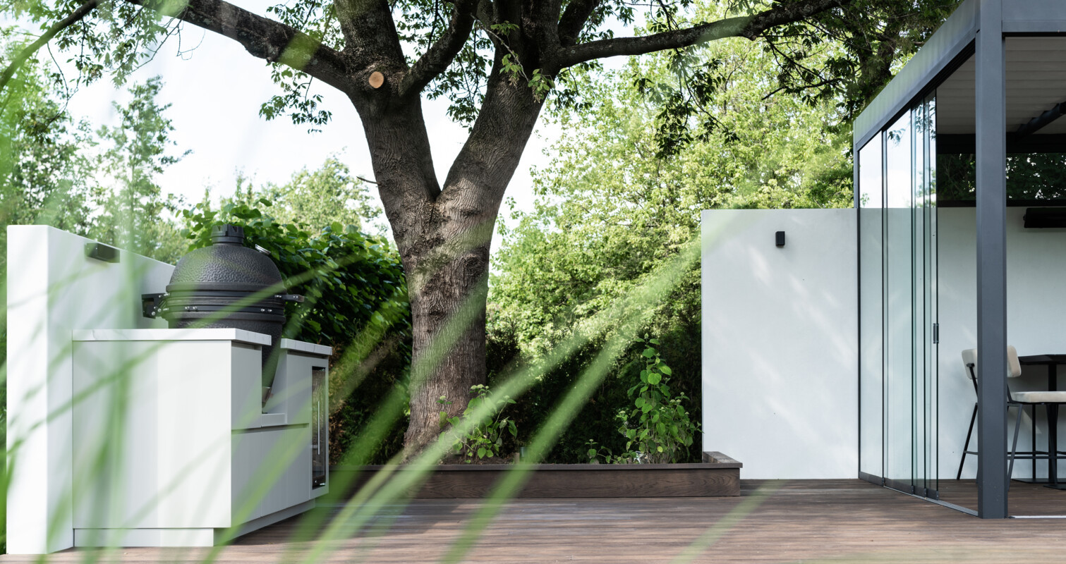 Comfort, luxe en een optimale balans in het totale ontwerp. Deze twee buitenkeukens in het groene Beuningen bieden alles om een buitenleven op ultiem niveau te beleven. In samenwerking met Van van Ee werd een totaalontwerp gemaakt voor het terras, de buitenkamer en de buitenkeukens. Door één keuken in de buitenkamer te plaatsen en één buitenkeuken op het ruime terras daarbuiten is binnen drempelloos met buiten verbonden. De buitenkeuken in de tuinkamer is voorzien van een luxe outdoor koelkast, spoelbak met kraan en een sfeervolle bar aan de achterzijde. De keuken buiten is uitgevoerd als de ultieme barbecue-keuken. De bestaande Bastard-kamado van de klant is naadloos ingebouwd en wordt compleet gemaakt door een Indu+ kookplaat en nog een outdoor koelkast.