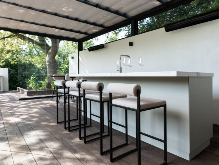 Beide buitenkeukens hebben een kenmerkend, modern ontwerp waarin design en comfort moeiteloos samengaan. De strakke aluminium basis is voorzien van een warm-gekleurde coating die perfect aansluit op het matte, Dekton werkblad. Door de buitenkeukens te voorzien van luxe accessoires zoals de Bastard barbecue, inductie-kookplaat en maar liefst twee outdoor koelkasten is ultiem comfort gegarandeerd.