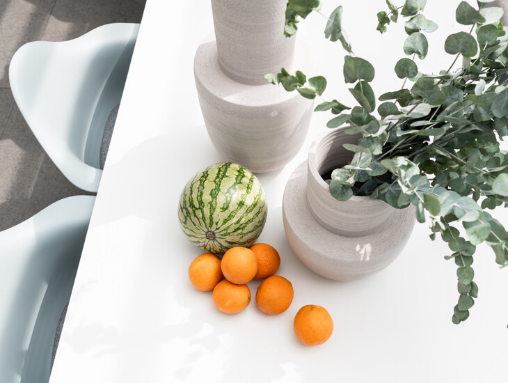 Modern en wit: deze COOXS buitenkeuken is een opvallend element op dit hoogwaardig vormgegeven terras. De luxe buitenkeuken is uitgevoerd met een comfortabele gasbarbecue, buitenkoelkast en spoelbak met kraan. Door het model met een bar te ontwerpen schuiven vrienden en familie altijd eenvoudig aan en is genieten binnen handbereik.