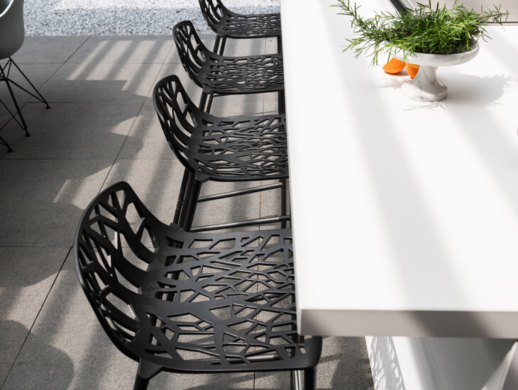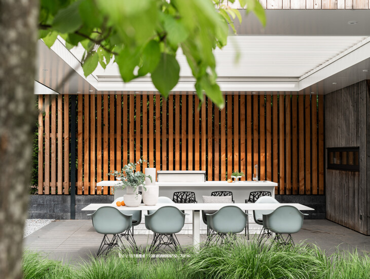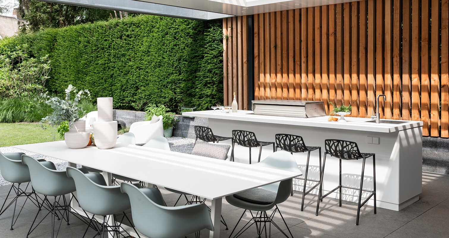 De bewoners van deze bosvilla in Oosterbeek zijn echte liefhebbers van modern design. Dit is terug te zien in de woning en wilde ze doortrekken naar buiten. Dat is goed gelukt met de moderne, witte buitenkeuken. Het wit wordt in balans gebracht door de houten achterwand en zwarte barkrukken. Zo ontstaat een elegant en tijdloos totaalbeeld.
