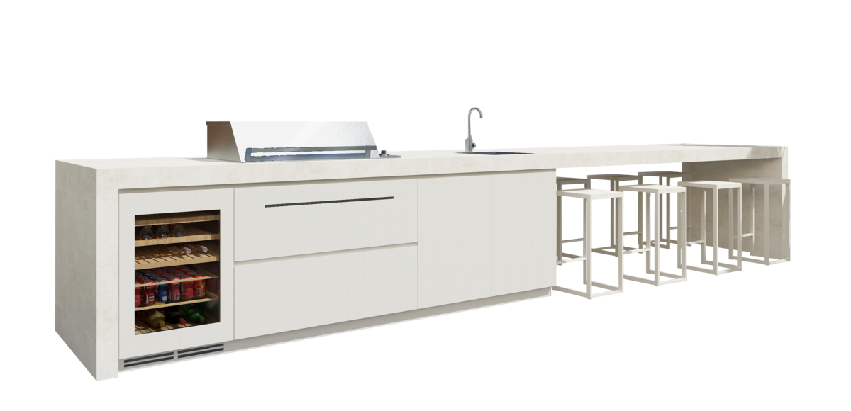 An outdoor kitchen, according to the designers at COOXS, should not only be high-quality in design and finish. The accessories should also contribute to a delightful outdoor moment. That's why we exclusively choose the best brands. In this design, we've opted for a barbecue from Beefeater and a luxurious outdoor refrigerator.