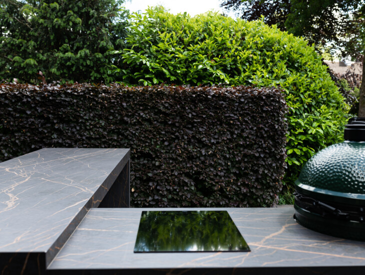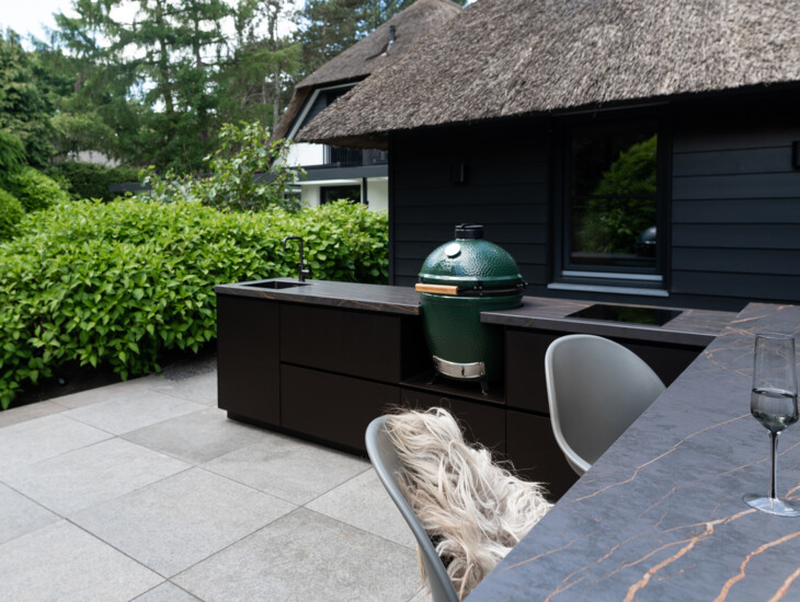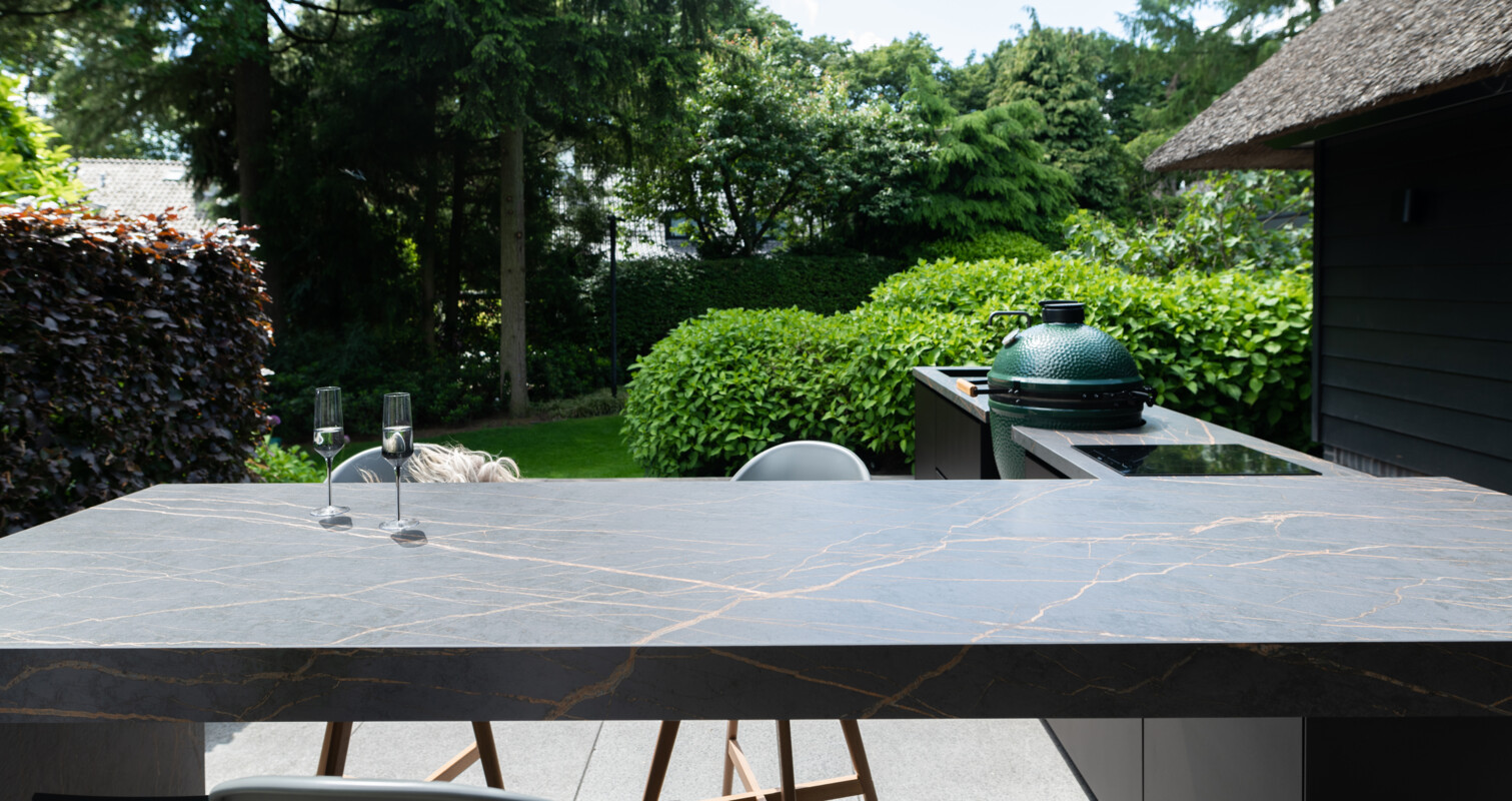 The design of the outdoor kitchen has a distinctive character thanks to the exclusive materials and clear design. By making the bar of the outdoor kitchen extra robust compared to the kitchen countertop, the outdoor kitchen acquires a characteristic look and adds depth to the design.