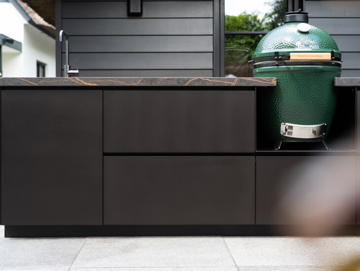 In the heart of Het Gooi, COOXS created this exclusive outdoor kitchen filled with luxurious appliances and a comfortable bar. The surroundings of the terrace played a significant role in designing this exceptional outdoor kitchen. Therefore, the material selection was made to beautifully complement the architecture of the house, and the layout of the outdoor kitchen is balanced with the terrace. At the center of the kitchen, a Big Green Egg Large is placed, flanked by the Indu+ induction cooktop and the sink with faucet. Thanks to this exclusive equipment, the outdoor kitchen is not only a feast for the eyes but also provides the ultimate user experience.