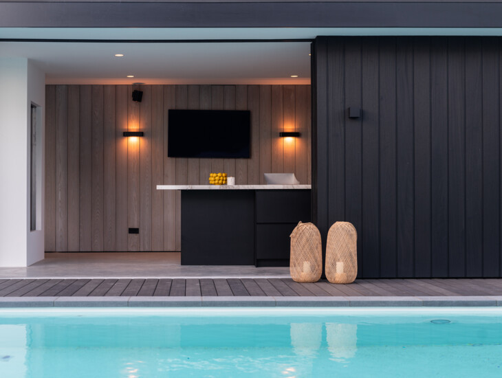 In this design, a modern approach was chosen in which all the equipment is integrated. COOXS designed a custom enclosure for the refrigerators behind the kitchen, while the rest of the equipment is housed in the kitchen block. The outdoor kitchen features an exclusive outdoor teppanyaki and induction cooktop from the Belgian brand Indu+. Additionally, the outdoor kitchen includes a sink with a faucet to complete the setup.