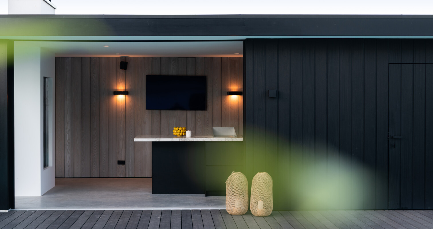 The ultimate outdoor living experience begins with choosing the right materials. This client chose to create an exclusive outdoor retreat for their outdoor lifestyle. COOXS was entrusted with the challenge of designing and creating an outdoor bar for this outdoor retreat, aiming to achieve the ultimate level of comfort. A modern kitchen was chosen as the central focal point. The standout feature in the entire setup is the custom-made refrigerator enclosure and matching shelf behind the kitchen. This way, the equipment seamlessly blends with the outdoor kitchen's design, creating a cozy ambiance.