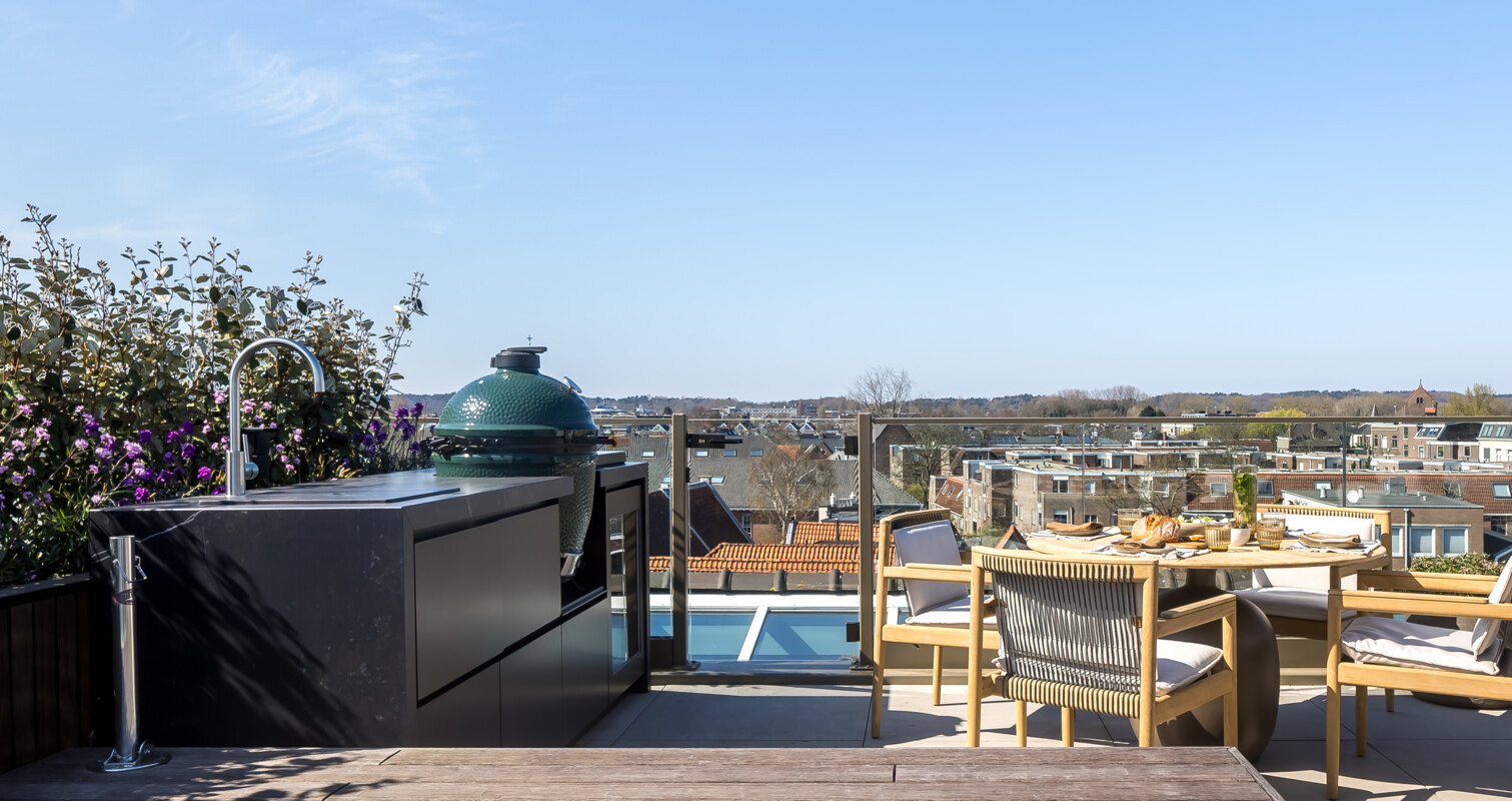 The rooftop terrace of this penthouse is exceptional, thanks to its fantastic view and ultimate luxury and comfort. As the centerpiece of the rooftop terrace, the COOXS outdoor kitchen was designed. Featuring a Big Green Egg as the focal point for culinary creations and luxury appliances such as the Fhiaba wine cooler, sink with faucet, and induction cooktop, this setup elevates comfort to the highest level. Enjoyment at its finest, in the city and in comfort.