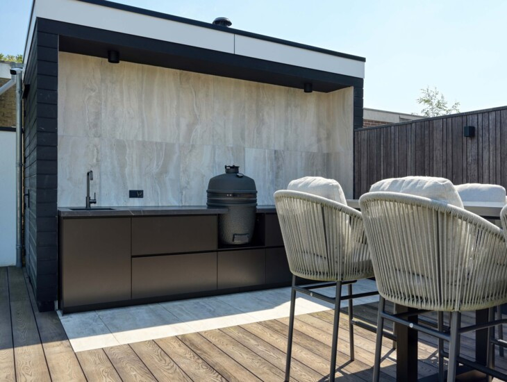 The residents of this stunning new-build villa had a modern garden designed, characterized by abundant greenery, in the same style as the house. As the heart of the central terrace, there was a desire for an exclusive outdoor kitchen in the same style as the home and garden. An elegant hotel-chic design was chosen, with attention to every detail. The central feature of the kitchen is the built-in Bastard barbecue, flanked by a sink with a faucet, an induction cooktop, and a high-end outdoor refrigerator. All this comfortable equipment is brought together in one balanced design.