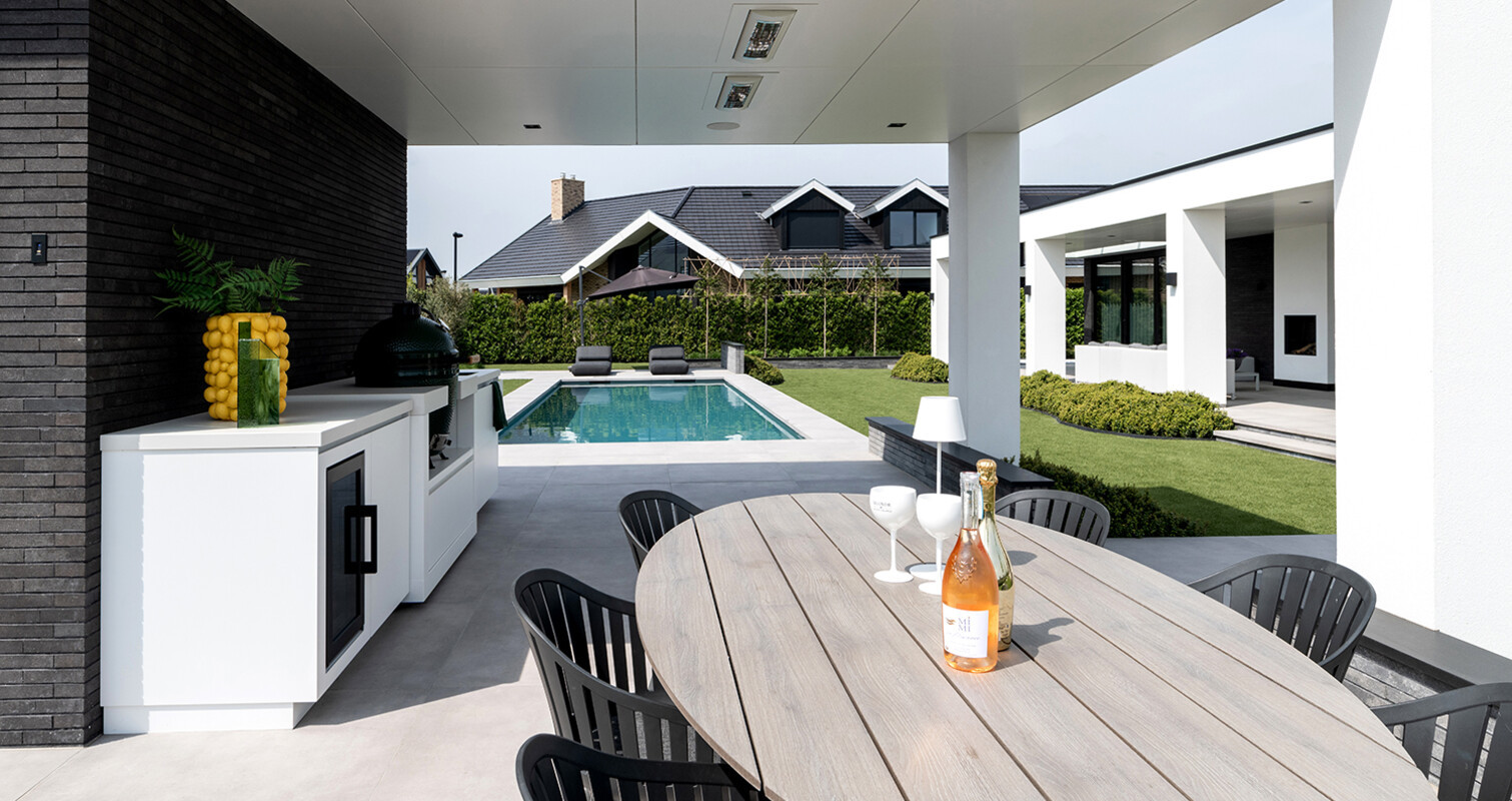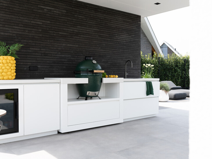 The design of the COOXS outdoor kitchen is aligned with both the architecture of the house and the garden. The timeless white color scheme is seamlessly integrated, and the proportions of the outdoor kitchen are balanced with those of the pool house.