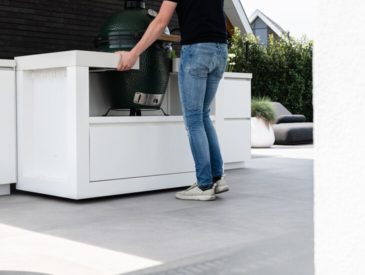 The perfect combination of fixed and mobile. This COOXS outdoor kitchen in Veenendaal combines the mobile COOXS Carrier with a Big Green Egg and two fixed elements. Combined into one exceptional outdoor kitchen equipped with all the conveniences. When designing the outdoor kitchen, careful consideration was given to how it will be used. This not only makes the outdoor kitchen a design gem but also a beacon of ultimate comfort.