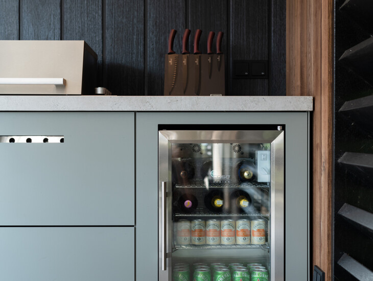 The centerpiece of the kitchen is the Beefeater barbecue. This modernly designed barbecue, made in Australia, not only fits well into the design but is also the ideal barbecue for every home cook. The gas can be adjusted in multiple zones, and thanks to its flexible layout, every dish can be prepared with ease.