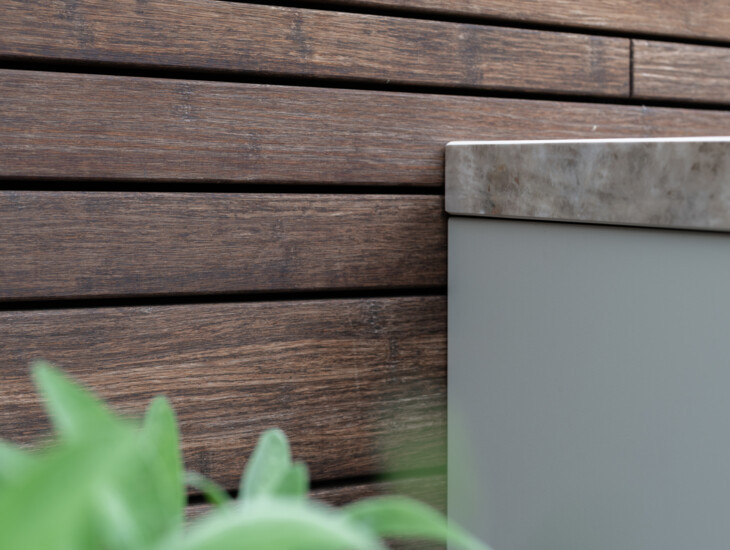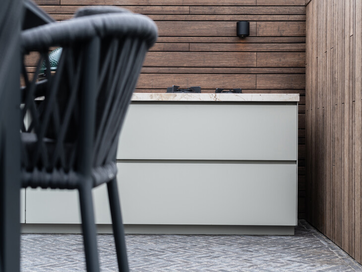 The design of this charming outdoor kitchen features a distinctive combination of materials. The aluminum, coated in an inviting color, pairs beautifully with the high-gloss Dekton countertop. This combination is perfectly coordinated with the other materials in the garden, creating a balanced harmony in the overall design.